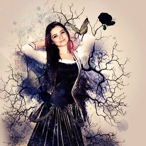 Шаг 6.Создайте два новых слоя под слоем Текстура 1. Установите основной цвет - черный. Возьмите две любые кисти дерева и нарисуйте за спиной модели. Вы можете использовать инструмент Трансформации/ Transform tool и добавить маску слоя, чтобы удалить ненужные части: