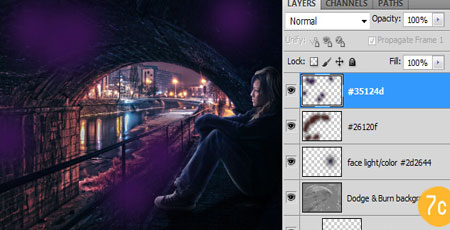 Вначале, я использовал цветовой оттенок # 2D2664 и нарисовал единственное мягкое пятно перед лицом девушки и её руками, обнимающими колени, что поможет окрасить её лицо и придаст больше фиолетового оттенка, а также сделает лицо светлее. Я использовал кисть 600 px.