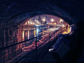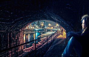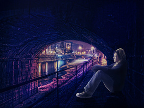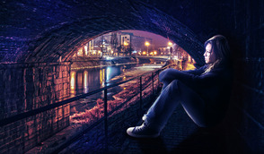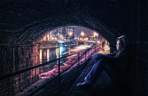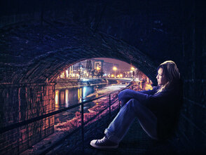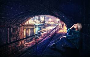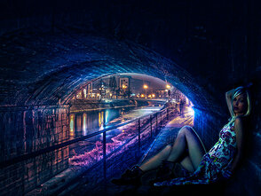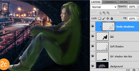 ШАГ 5. Это моя любимая часть. Я создал световые эффекты на теле девушки с помощью маленькой кисти. Свет идёт от городского освещения и попадает под мост. Способ, с помощью которого я имитировал эффект освещения на девушке – это создание небольшой световой кромки.