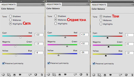 Настройки для корректирующего слоя Цветовой баланс (Color Balance):