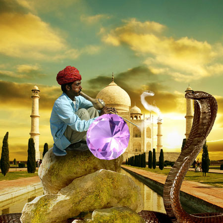 Отделите змейку от фона, и далее переместите на наш документ, расположив таким образом, как будто она появляется из дудочки заклинателя змей: