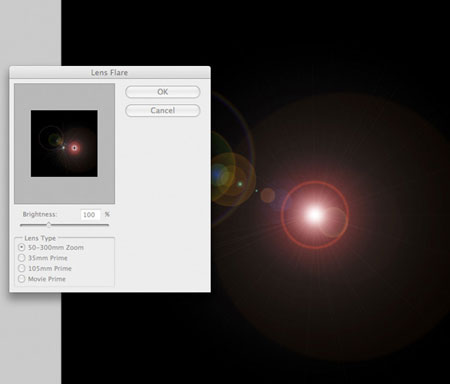 Затем идем Фильтр – Рендеринг – Блик (filter>render>lens flare) и применяем Тип объектива (Zoom flare) 50-300mm, Яркость (brightness) 100%. Попробуйте расположить световой блик на выходе из дудочки заклинателя: