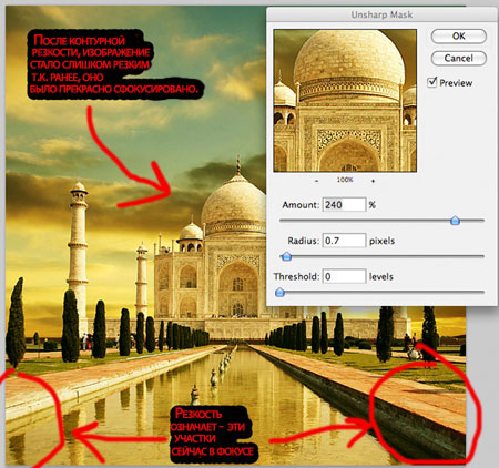 На скриншоте ниже, вы можете увидеть наше изображение после применения контурной резкости. Однако, в действительности мы хотели применить резкость только к нижним углам нашего изображения для того, чтобы сфокусировать их. В остальных частях изображения уже слишком много резкости: