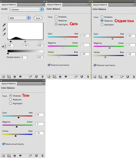 Примените корректирующие слои Уровни (levels) и Цветовой баланс (color balance):