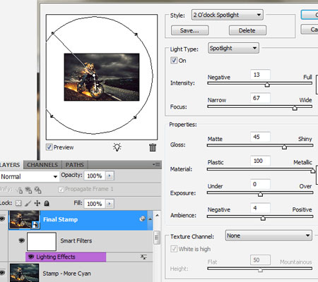 Я сфокусировал свет на байкере а также затемнил правую сторону изображения, которая на мой взгляд менее интересная, используя настройки сужения фокуса. Итак, я создал ещё один штамп и применил фильтр к новому слою со штампом, который я назвал Итоговый Штамп.