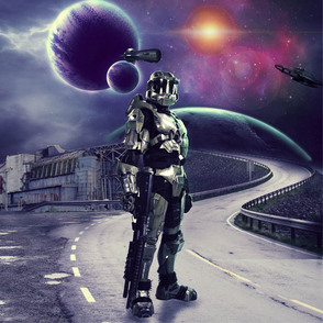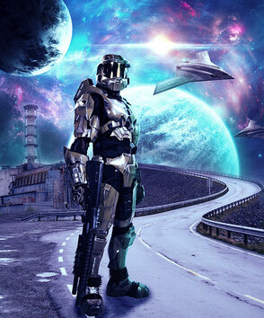 Нам осталось добавить промышленное здание на задний фон и изображение космического воина. Из-за высокого качества изображения и белого фона, на котором изображён космический воин, легче будет выделить его и переместить выделенное изображение на наш документ.