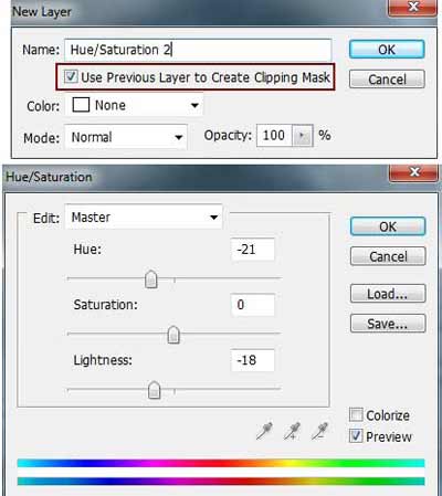 Создайте новый корректирующий слой Цветовой тон / Насыщенность (Hue/Saturation) поверх корректирующего слоя Цветовой баланс (Color Balance), идём Слой- Новый корректирующий слой – Цветовой тон / Насыщенность (Layer-New adjustment Layer-Hue/Saturation), чтобы уменьшить насыщенность фрагментов: