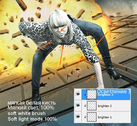 Некоторые участки модели всё ещё тёмные в сравнении с задним фоном. Поэтому, я использовал 3 новых слоя (в качестве обтравочных масок) и применил белую кисть на этих слоях. Для одного слоя, я установил режим наложения Перекрытие (Overlay), непрозрачность слоя 100%, для двух остальных слоёв, я установил режим наложения Мягкий свет (Soft light), непрозрачность слоя 100%.