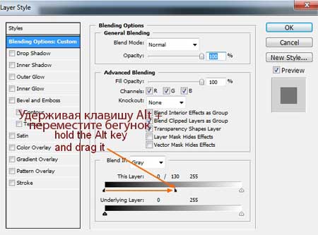 Для того, чтобы удалить тёмную часть заднего фона, я использую опцию Наложить, если (Blend If). Щёлкните правой кнопкой по слою с взрывом, в появившемся окне, выберите опцию Параметры наложения (Blending options). Удерживая клавишу Alt + переместите правый чёрный бегунок: