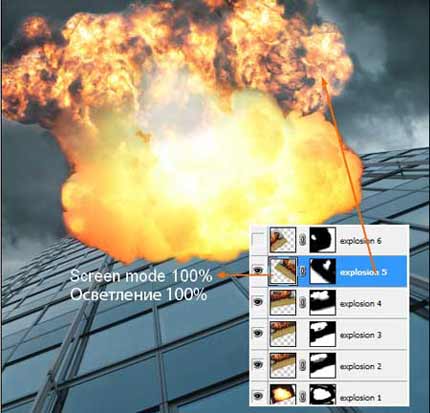 Продублируйте слой “взрыв 2”. Для слоя с дубликатом, поменяйте режим наложения на Осветление (Screen), непрозрачность слоя 100%. Как всегда, я использовал слой- маску, чтобы скрыть нежелательные участки: