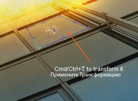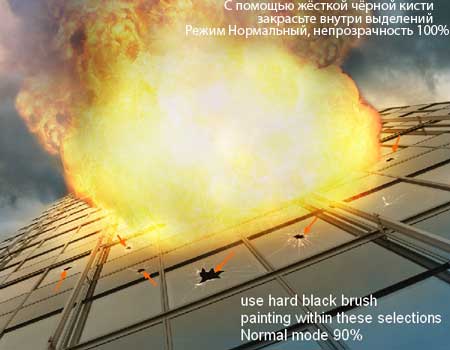 Сейчас, мы создадим эффект разбитого стекла, явившейся причиной взрыва. Создайте новый слой ниже слоёв с взрывами (поверх слоя со зданием). Примените кисти Разбитое стекло, номер кисти 997 (или любую другую кисть, которая вам больше нравится) на стекле рядом с взрывом. Нажмите Ctrl+ T для трансформации изображения в соответствии с перспективой здания: