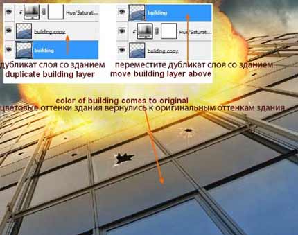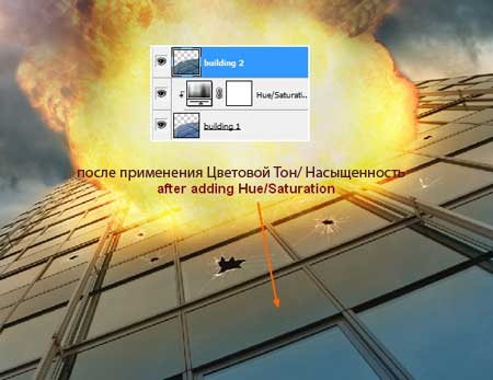 С этого шага, мы будем создать разлетающиеся фрагменты здания ставшие причиной взрыва. Возвращаемся на слой со зданием, и дублируем его. Расположите слой с дубликатом поверх оригинального слоя со зданием и корректирующего слоя Цветовой тон / Насыщенность (Hue/Saturation layer).