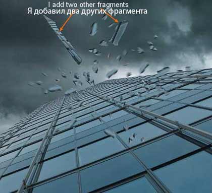 Чтобы создать отражение (тень) фрагментов на окнах здания, я выбрал фрагменты, которые очень близко расположены к окнам, продублировал их и применил к нижнему слою Трансформацию, идём Редактирование – Трансформация- Отразить по вертикали (Edit-Transform-Flip Vertical), сместите этот слой, как бы создавая тень на стекле от фрагментов стекла и уменьшите непрозрачность слоя до 25%. Переместите слой с тенью в группу с фрагментами, расположив ниже всех слоёв.