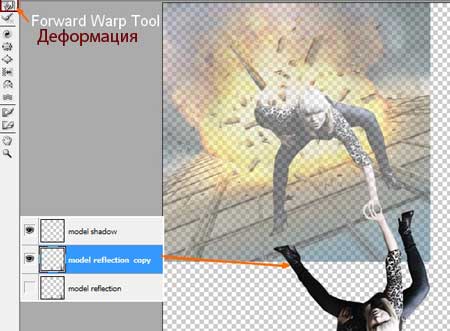 Можно увидеть, что почти всё отражение руки синхронно отражает руку модели, и отражение ног модели также должно синхронно отражать ноги модели. Для того, чтобы это осуществить без потери качества изображения, продублируйте слой с отражением модели и у нас будет копия отражения модели. Скройте видимость слоя с отражением модели, затем, находясь на копии слоя с отражением модели, идём Фильтр- Пластика (Filter-Liquify). Выберите инструмент Деформация (Forward Warp Tool), настройки примените, как на скриншоте ниже (поставьте галочку в окошке Дополнительные параметры (Show backdrop), чтобы вам легче было видеть, при использовании инструмента). В зависимости от размеров вашего документа, вы можете применить соответствующие размеры кисти.