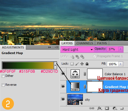 Начнём с цветовой коррекции изображения с городом. Я использовал корректирующий слой Карта градиента (Gradient Map), для данного корректирующего слоя примените режим наложения Жёсткий свет (Hard light), непрозрачность слоя 37% и ещё один корректирующий слой Цветовой баланс (Color Balance).