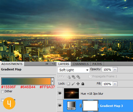 Я применил ещё один корректирующий слой Карта градиента (Gradient Map) для дополнительной коррекции обоих слоёв (поэтому, не используйте данный корректирующий слой в качестве обтравочной маски) и для того, чтобы создать заключительный цветовой оттенок. Для данного корректирующего слоя примените режим наложения Мягкий свет (Soft light), непрозрачность слоя 100%, номера цветовых оттенков указаны на скриншоте 4. Также, я добавил световой блик, поменял режим наложения для слоя со световым бликом на Осветление (Screen), изменил Цветовой тон (Hue) и применил небольшое размытие.