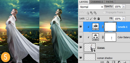 Вы можете добавить женщину, как показано на скриншоте ниже. Для коррекции, я использовал корректирующие слои Цветовой баланс (Color Balance) и Уровни (Levels). Настройки для корректирующего слоя Цветовой баланс (Color Balance):