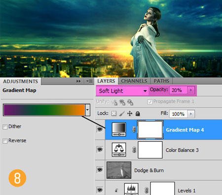 Добавьте ещё корректирующих слоёв для создания заключительного цветового и контрастного эффекта. Я использовал корректирующие слои Цветовой баланс (Color Balance) и Карта градиента (Gradient Map), для данного корректирующего слоя, поменяйте режим наложения на Мягкий свет (Soft light), непрозрачность слоя установите 20%.