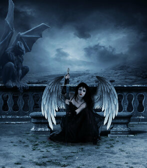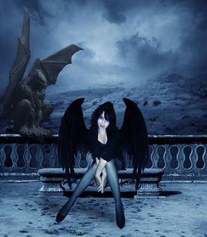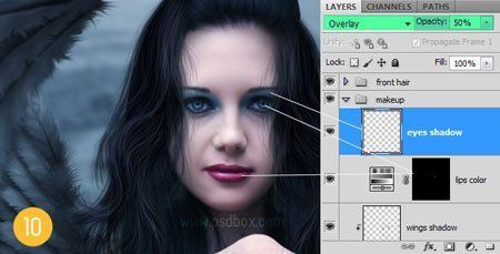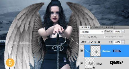 Крылья почти сложены вокруг женского тела, поэтому, я добавил тени на её плечи и руки. Эти тени я нарисовал на новом слое, который я использовал в качестве обтравочной маски к слою с девушкой. С помощью мягкой чёрной кисти с низкой непрозрачностью, нарисуйте мягкие тени.