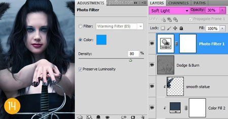 Заключительный цветовой эффект и эффект контраста был создан с помощью корректирующего слоя Фото Фильтр (Photo Filter), цветовой оттенок #029cff, Плотность (Density) 80%, режим наложения Мягкий свет (Soft light) и непрозрачность слоя 30%.