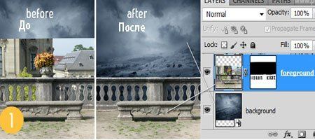 Я создал новый документ 2800×3200 px. Далее, я открыл стоковое изображение Переднего плана (балкон со скамьёй) и с помощью слой- маски я скрыл задний фон на данном изображении. Затем, я открыл стоковое изображение Заднего плана (небо с пейзажем), скопируйте / вклейте данное изображение на новый слой, расположив данный слой ниже слоя с балконом и скамьёй.
