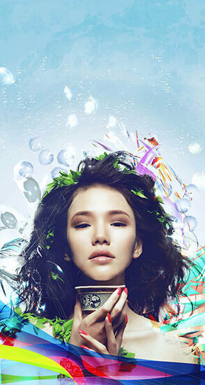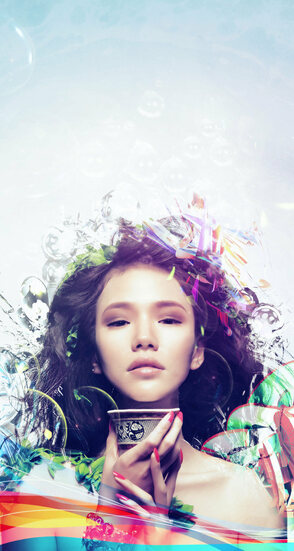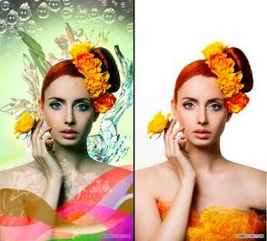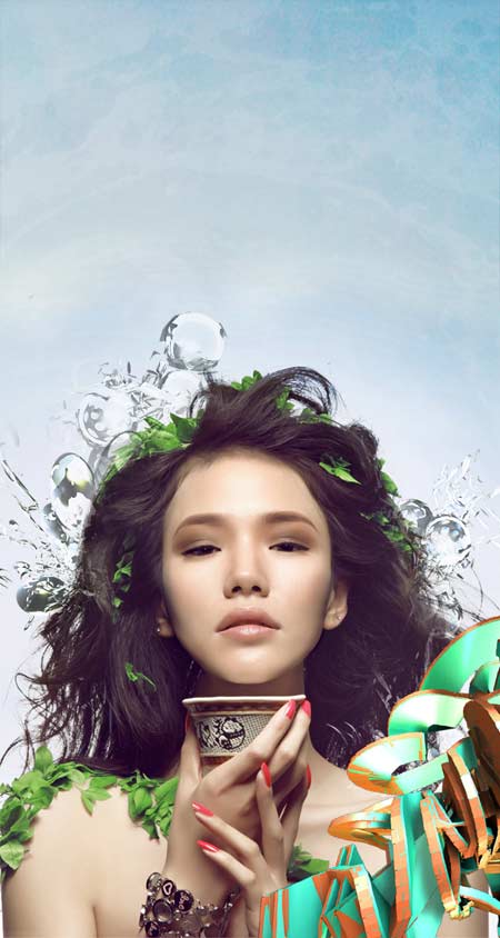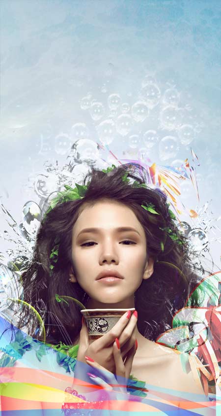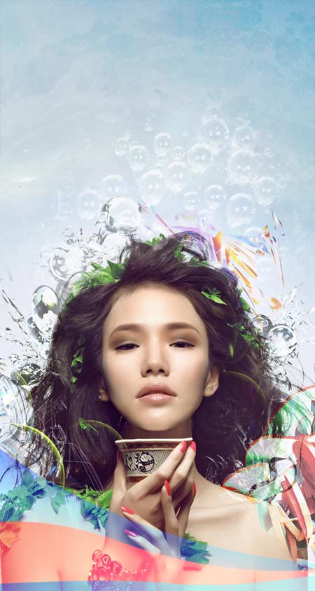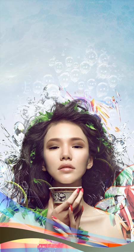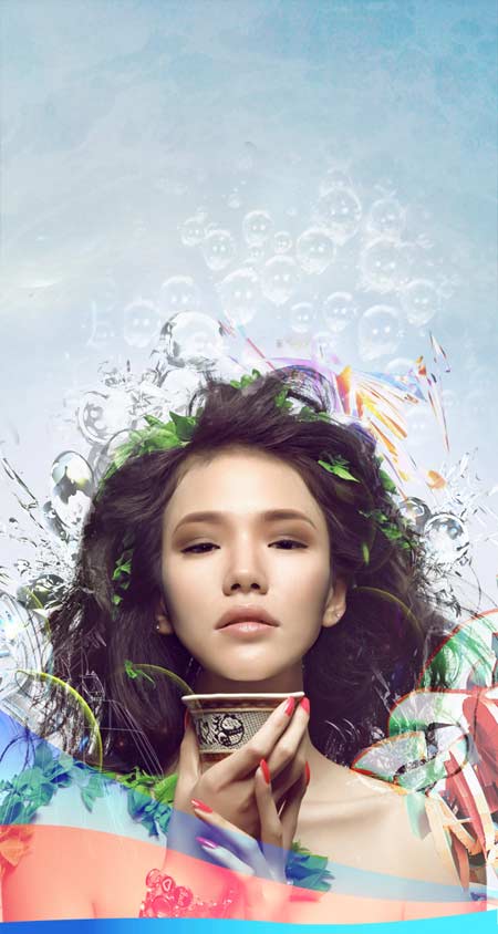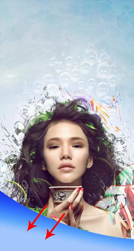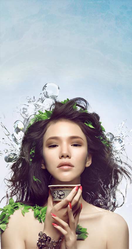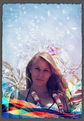 Т.к. пространство над головой модели немного пустое, давайте добавим ещё одно стоковое изображение. Хорошо будет добавить пузырьки, т.к. они не очень навязчивы при уменьшении непрозрачности. Скачайте пузырьки здесь.