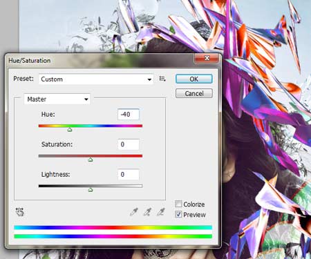Далее, нажмите клавиши Ctrl + U или идём. Изображение – Коррекция – Цветовой тон / Насыщенность (Image > Adjustments > Hue/Saturation) и применяем следующие настройки.