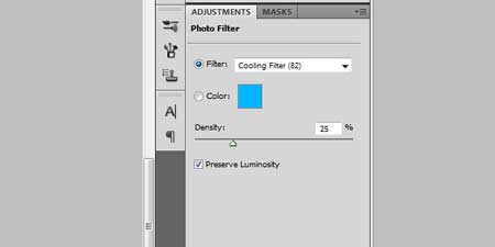 Далее, создайте ещё один корректирующий слой Фотофильтр (Photo Filter). Примените следующие настройки.