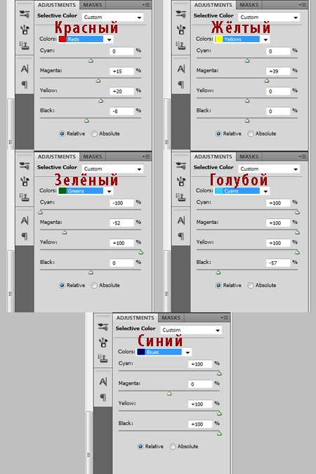 В заключение, создайте последний корректирующий слой Выборочная коррекция цвета (Selective Color). Примените следующие настройки.