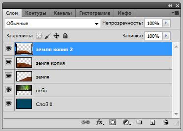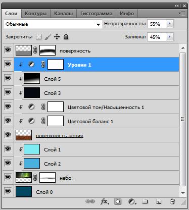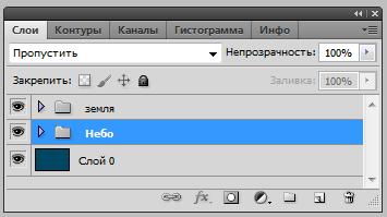 Из полученных слоев создадим две группы. Становимся на слой "Небо". Зажимаем клавишу " shift ", далее левой клавишей мыши делаем клик на "слой1". Получаем выделение трех слоев. Нажимаем комбинацию " ctrl + G ". Получаем группу. Назовите всю группу "Небо". Проделайте предыдущие шаги и образуйте группу "Земля" ( в нее войдут слои "поверхность" и все вышестоящие , которые мы применили как обтравочные маски).