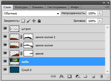 Встаньте на слой "Штамп" зажмите клавишу " shift " и кликните на слой "Земля" ( для выделения ряда слоев). Нажмите комбинацию " ctrl+е " ( для слития слоев). Назовите полученный слой "Поверхность".