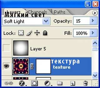 Поменяйте режим наложения для объединённого слоя с текстурой на Мягкий свет (soft light) и уменьшите непрозрачность слоя до 15%:
