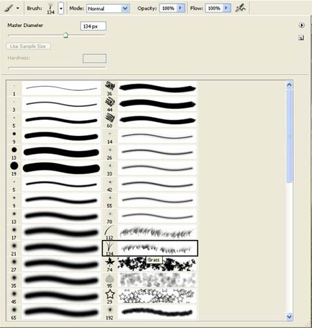 (brush tool (B), далее, щёлкните правой кнопкой по документу, чтобы появилось окно настроек кисти. Выберите кисть, как на скриншоте ниже: