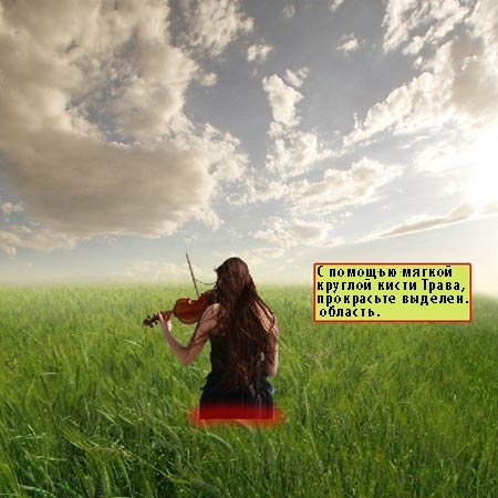 Примечание переводчика: Вначале, к слою с девушкой, добавьте слой- маску. Далее, установите стандартную кисть по умолчанию: ТРАВА. Далее, на слой- маске, обработайте нижнюю часть девушки, создавая ощущение высокой травы.