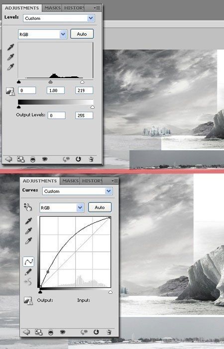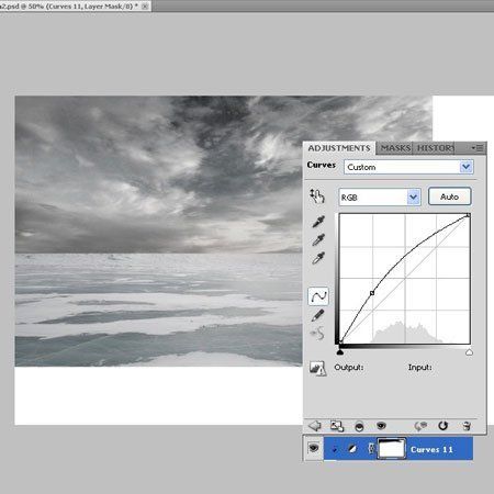 Открываем фото замерзшего озера и размещаем в нижнем левом углу. Используем Curves (Кривые) с обтравочной маской. Создаем слой-маску и удаляем лишние области изображения.