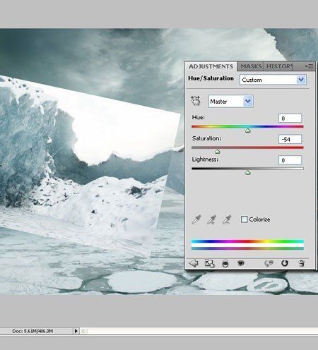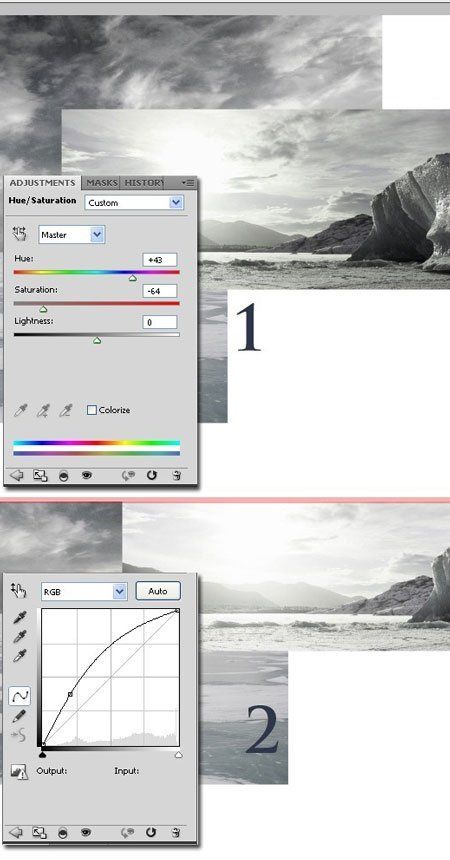Снова открываем фото айсберга и размещаем в верхнем правом углу. Удаляем лишние области. Добавляем Curves (Кривые) и Hue/Saturation (Цветовой тон/Насыщенность) с параметрами из предыдущего фото.