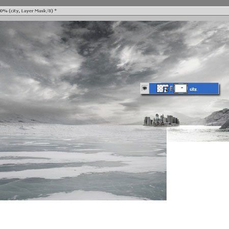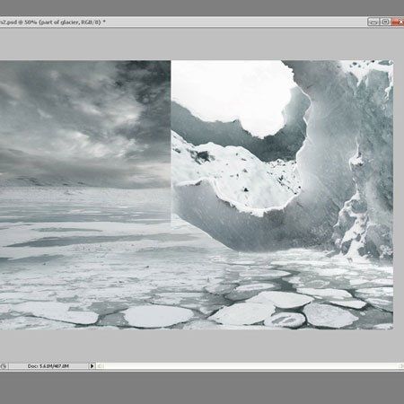 В этом шаге мы добавим большой айсберг на фоне. Мы будем использовать три фото одного айсберга, снятых с разных ракурсов. Открываем первое и размещаем, как показано ниже.