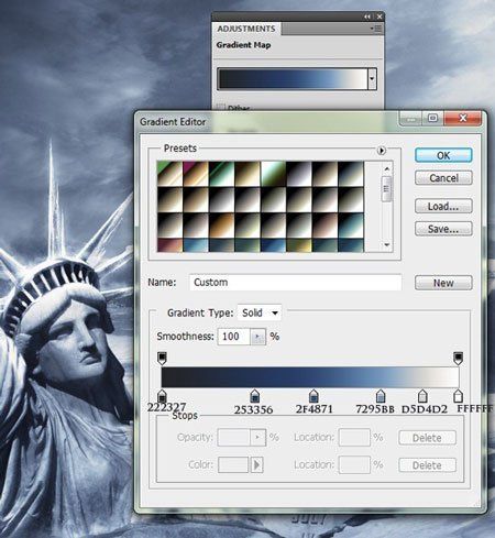 Добавляем корректирующий слой Gradient Map (Карта градиента). Он нам нужен для того, чтобы добавить холодных оттенков. Устанавливаем непрозрачность слоя на 33%.