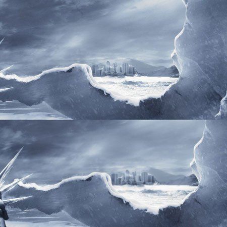Продолжаем создавать оледенелости на фоне. Открываем следующее фото льда и размещаем так, чтобы оно являлось продолжением предыдущего. Теперь мы должны откорректировать его цвет. Применяем корректирующие слои, как показано ниже. Все они должны являться обтравочнми масками слоя с айсбергом. Закончив коррекцию цвета, добавляем слой-маску и стираем все, кроме небольшой области льда.