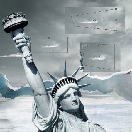 В этом шаге мы добавим небольшую лодку, чтобы подчеркнуть огромный размер статуи. Располагаем судно на снегу в правом углу и вырезаем.