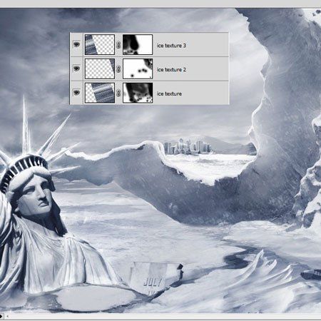 В этом шаге мы добавим больше снега вокруг Статуи Свободы. Открываем необходимое фото и размещаем его за статуей. Маскируем края и меняем режим смешивания на Screen (Осветление).