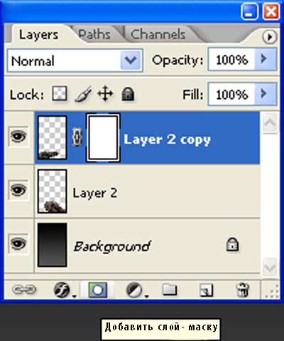 Далее, к дубликату слоя со скалой, добавьте слой- маску, кнопку Добавить слой- маску