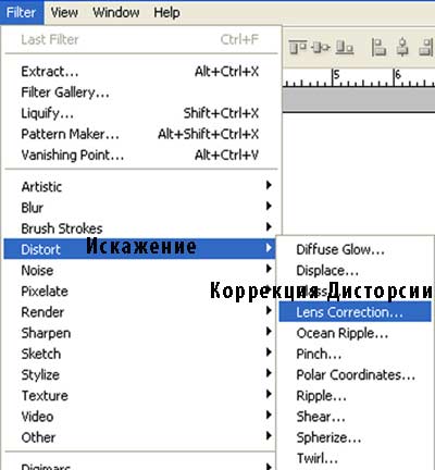 Далее, идём Фильтр – Искажение – Коррекция Дисторсии (Filer > Distort > lens correction):