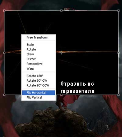 Далее, выберите инструмент Трансформация (Transform tool (Ctrl +T), щёлкните правой кнопкой по документу и в появившемся окне, выберите опцию Отразить по горизонтали (Flip Horizontal).