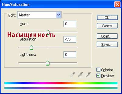 Когда появится окно настроек корректирующего слоя Цветовой тон / Насыщенность (Hue/Saturation), примените настройки, которые указаны на скриншоте ниже. Удерживая клавишу Alt + щёлкните между двумя слоями (между корректирующим слоем Кривые (Curves) и корректирующим слоем Цветовой тон / Насыщенность (Hue/Saturation) для создания обтравочной маски).