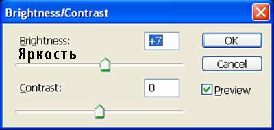 Когда появится окно настроек корректирующего слоя Яркость / Контрастность (Brightness/Contrast), примените настройки, которые указаны на скриншоте ниже. Удерживая клавишу Alt + щёлкните между двумя слоями (между корректирующим слоем Цветовой тон / Насыщенность (Hue/Saturation) и корректирующим слоем Яркость / Контрастность (Brightness/Contrast) для создания обтравочной маски).