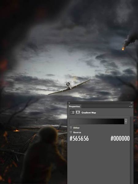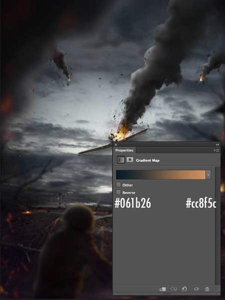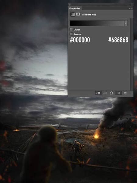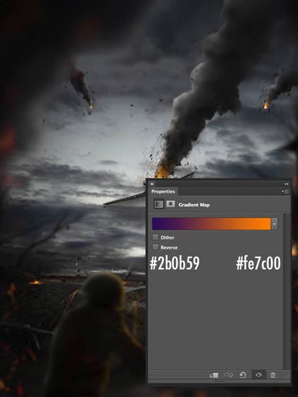 То же самое, что мы проделывали для изображения Неба и Земли, мы также используем ту же технику для коррекции света и цветовых оттенков для соответствия всей нашей сцены. Вначале, создайте корректирующий слой Карта Градиента (Gradient Map) к слою с дымом в качестве обтравочной маски. Для корректирующего слоя Карта Градиента (Gradient Map), примените значения, которые указаны на скриншоте ниже.