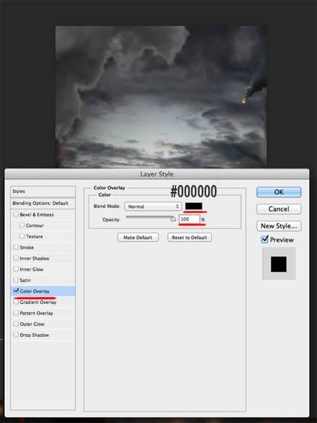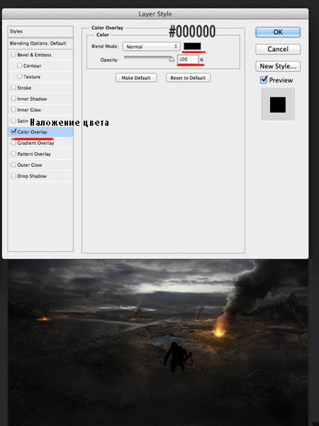 Правой кнопкой мыши щёлкните по слою с дымом, который вы создали только что и в появившемся окне, выберите опцию Параметры наложения (Blending Options). Далее, выбираем опцию Наложение цвета (Color Overlay) и применяем следующие значения, которые указаны на скриншоте ниже. (при необходимости, используйте инструмент Ластик