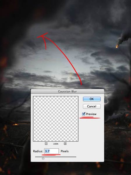 Перейдите на слой с дымом, который мы только что создали, а затем идём Фильтр – Размытие – Размытие по Гауссу (Filter > Blur > Gaussian Blur) и применяем радиус размытия, который указан на скриншоте ниже.