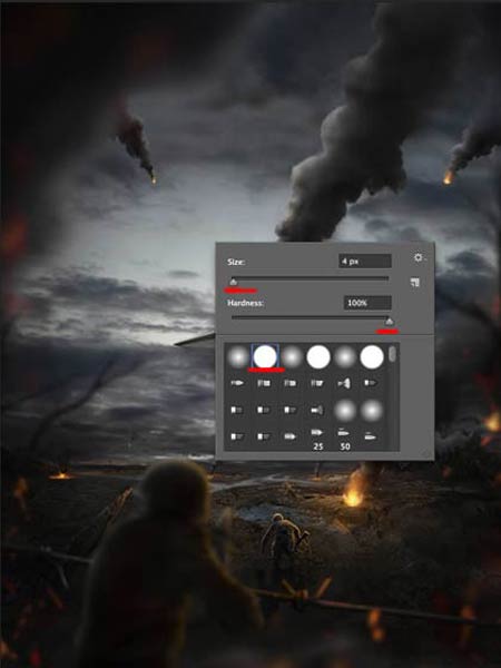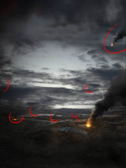 На данный момент, наша сцена выглядит немного пустой. Добавьте больше дыма и элементов огня, как это сделал я. Повторите Шаг 9 для получения того же результата. Кроме этого, используйте различные изображения дыма, комбинируйте их, чтобы получить различные конфигурации дыма. Также, варьируйте размер дыма. Поэкспериментируйте с непрозрачность дыма, чтобы дым красиво вписывался в нашу сцену. См. скриншоты ниже в качестве ссылки.